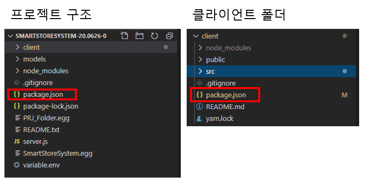 위와 같이 서버가 밖에 있으며, 그곳을 세팅하는 package.json 파일과 create-react-app 으로 프로젝트를 만들게 되면 그안에 client 폴더 안에 package.json 파일이 있습니다. 전자의 package.json은 서버 세팅을 위해 사용되고 후자는 리액트 프로젝트를 위해 사용됩니다.