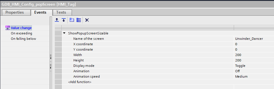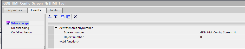 3. TAG에 Event 에서 Value change -> ActivateScreenByNumber 셋팅